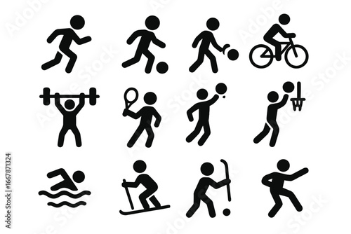 © Pat, Naklejka premium Sport icons set. People activities pictograms. Man playing football, basketball, tennis, swimming, cycling, weightlifting, skiing, hockey. Vector athlete silhouette symbol.