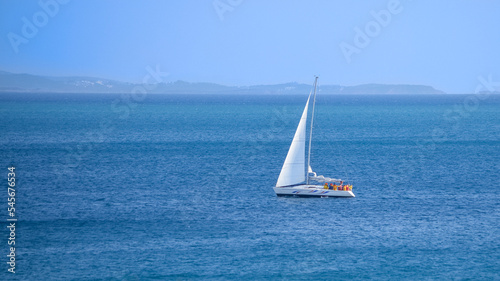 © Stratos Giannikos, Obraz premium Sport team on Sailing training boat in the morning at Saronic gulf. Piraeus ,Greece