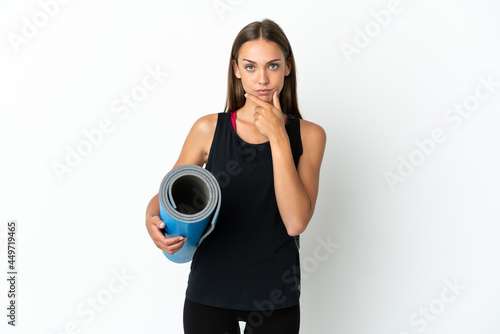 Fototapeta premium Sport woman going to yoga classes while holding a mat over isolated white background thinking