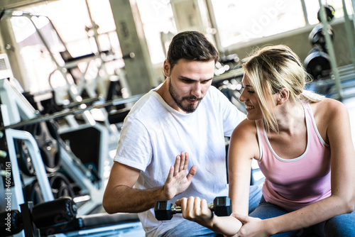 Obraz premium Sport women lifting dumbbell with trainer men in gym