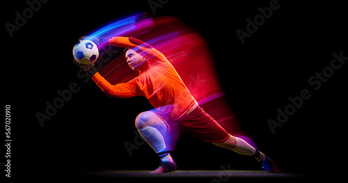 © Lustre Art Group , Fototapeta premium Sportive energetic man, soccer football goalkeeper in action, motion over dark background with mixed neon light. Concept of sport, achievement, competition, goals.