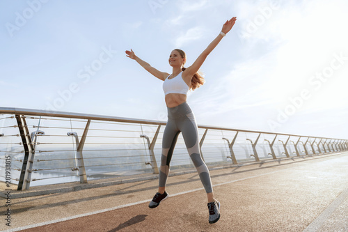 Obraz premium Sportive happy lady jumping up on foot bridge
