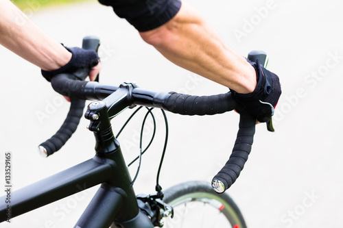 Fototapeta premium Sportler hat Hände am Lenker eines Rennrades, Rennlenker, Detail
