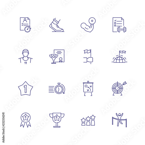 Naklejka premium Sports and competition icons. Set of line icons on white background. Stop watch, runner, champion. Sport concept. Vector illustration can be used for topics like championship, sport