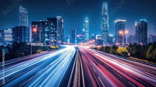 © Suphawan, Fototapeta premium Sports car driving along a modern highway with bright lights and tall skyscrapers under a clear night sky