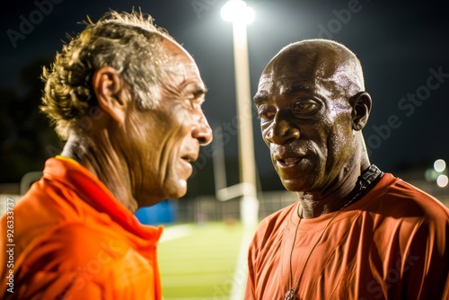 Naklejka premium Sports Coach Reprimanding Player on Field Conveying Discipline and Focus.