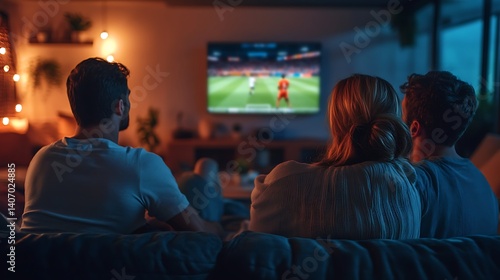 © AdorStudios, Obraz premium sports fans watching a football match on tv at home cheering celebrating and enjoying the excitement of the game with friends in a relaxed atmosphere