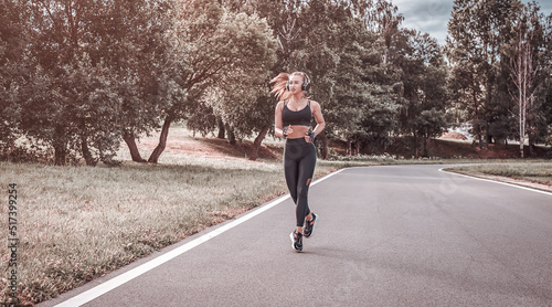 © andy_gin, Fototapeta premium Sports girl jogging in the park. The concept of a healthy lifestyle. Sports Equipment. Fitness style advertisement.