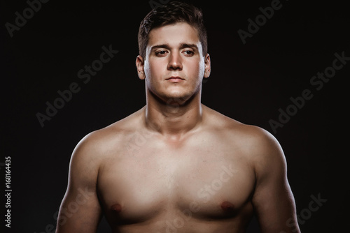 © sushytska, Fototapeta premium sports guy with a naked torso on a black background