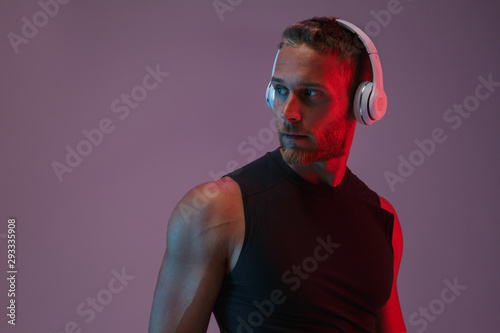 © Drobot Dean, Naklejka premium Sports man posing isolated listening music with headphones.