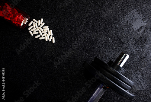 Naklejka premium Sports supplements with weights on dark background. Medicines