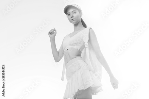© KDdesignphoto, Fototapeta premium Sports woman posing in fashion sportswear on sunny sky background. Beautiful slim girl in trendy skirt, top, cap and backpack. Black and white.