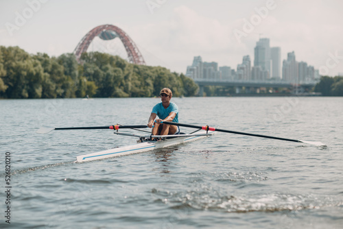 Naklejka premium Sportsman single scull man rower rowing on boat at Moscow River Russia
