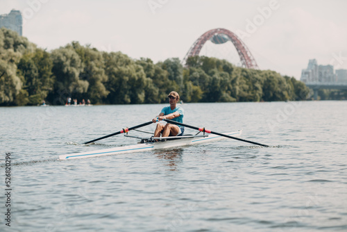 Naklejka premium Sportsman single scull man rower rowing on boat at Moscow River Russia