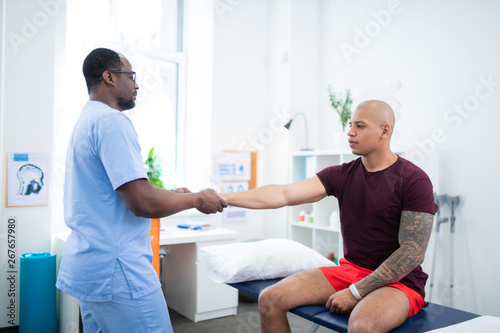 Obraz premium Sportsman with nice biceps visiting therapist after getting injury