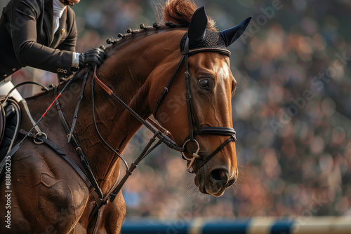© Natalia, Obraz premium Sportswoman on a horse at the hippodrome. Horse riding competitions at the Olympic Games
