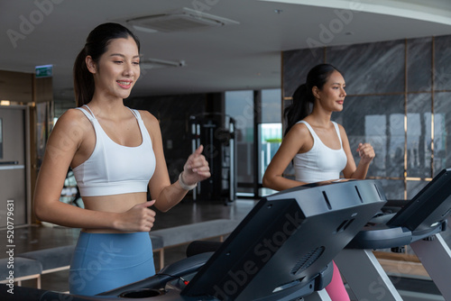 © Washburn, Obraz premium Sporty asia woman exercising on multistation at gym for arm and shoulders muscles. Fitness exercising in gym at condo
