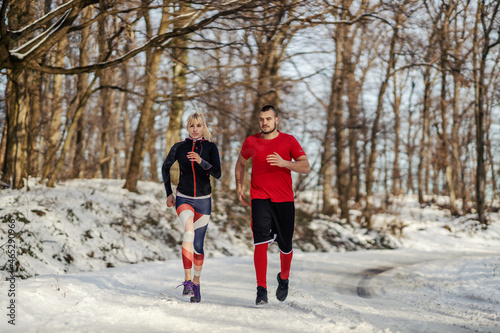 © Dusan Petkovic, Naklejka premium Sporty couple jogging together in nature at snowy winter day. Relationship, winter fitness, cardio exercises