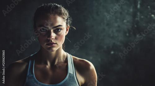 © Keopaserth, Obraz premium sporty female athlete with determined expression in dramatic lighting, showcasing strength and focus. background adds depth to intense atmosphere