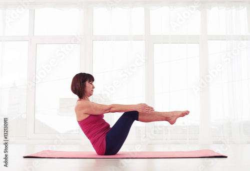 © ArtFamily, Fototapeta premium Sporty female working lateral abs in a gym on a yoga mat