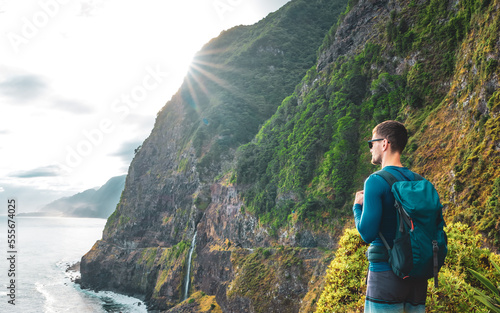 © Michael, Naklejka premium Sporty man looking at waterfall flowing into the sea in atmospheric morning atmosphere. Viewpoint Véu da Noiva, Madeira Island, Portugal, Europe.