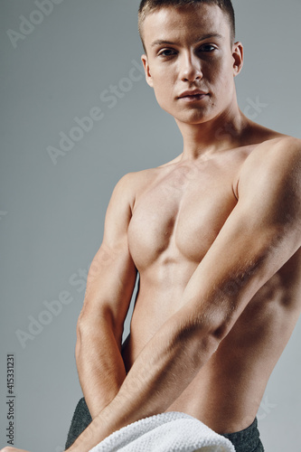 © SHOTPRIME STUDIO, Fototapeta premium sporty man with pumped body cropped view close-up isolated background