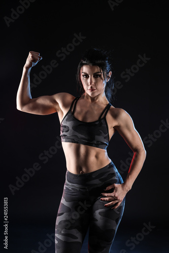 © Pixel-Shot, Obraz premium Sporty muscular woman on dark background