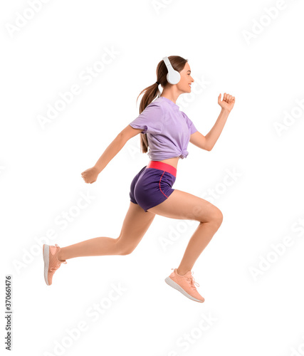 Fototapeta premium Sporty running young woman with headphones on white background