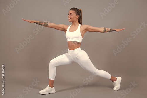 Fototapeta premium Sporty strong cheerful young woman posing on gray isolated background....