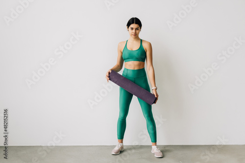 © F8 \ Suport Ukraine, Fototapeta premium Sporty woman holding yoga mat before or after fitness class on white background