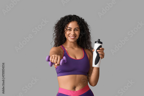 Naklejka premium Sporty young African-American female coach with water bottle and dumbbells on...