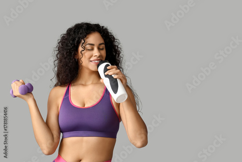 Fototapeta premium Sporty young African-American female coach with water bottle and dumbbells on...