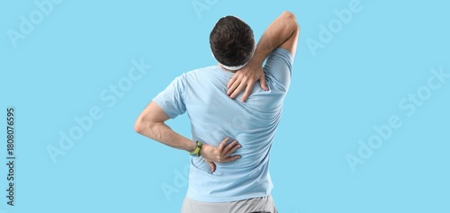 © Pixel-Shot, Obraz premium Sporty young man suffering from back pain on blue background