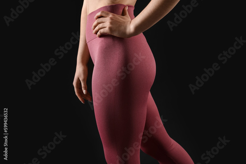 Naklejka premium Sporty young woman in leggings on black background, closeup