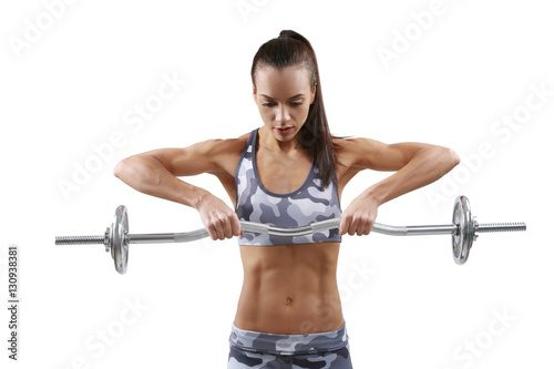 © Africa Studio, Obraz premium Sporty young woman with barbell on gray background