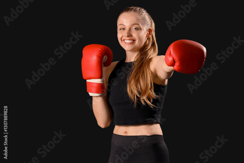 Fototapeta premium Sporty young woman with boxing gloves on black background