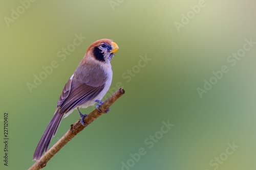 © Narupon, Naklejka premium Spot-breasted Parrotbill or Paradoxornis guttaticollis, beautiful brown bird perching on branch with green background at Doi sun juh, Thailand.