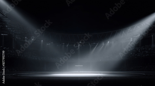 Fototapeta premium Spotlight stadium arena night light beam empty stage dramatic atmosphere circle track sport event anticipation
