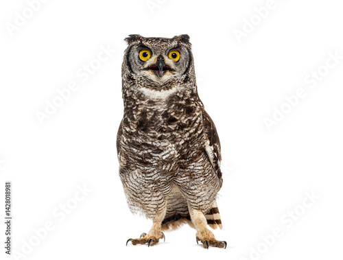 Fototapeta premium spotted eagle owl, bubo africanus, also known as african eagle owl, standing on a white background, looking up with its beak open