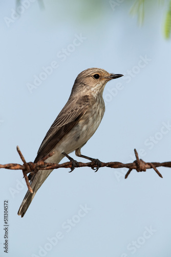 Fototapeta premium Spotted Flycatcher perched on fence wire, Bahrain