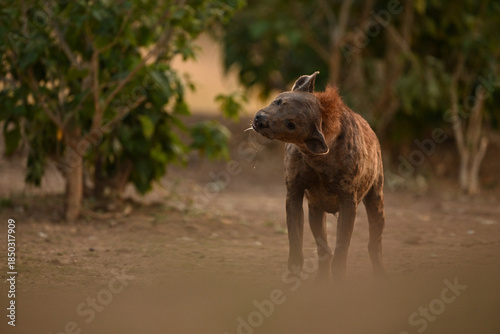 © Nick Dale, Fototapeta premium Spotted hyena standing on grass shaking head