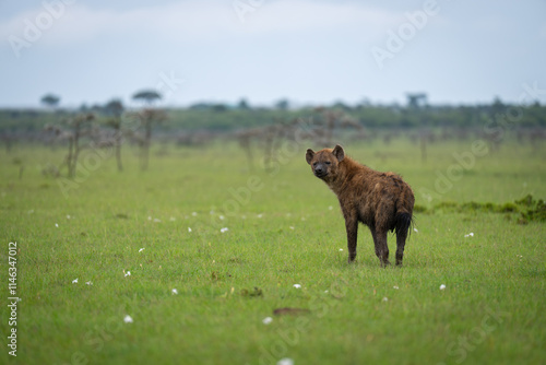Fototapeta premium Spotted hyena stands near thornbushes watching camera