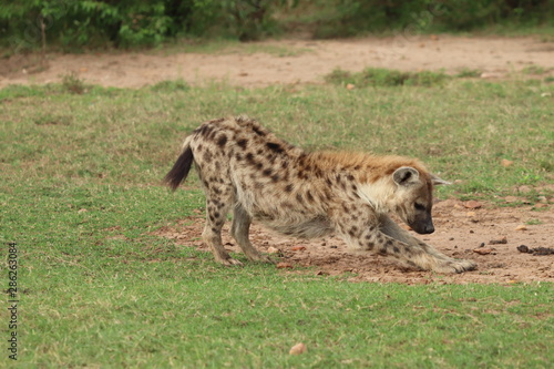 Obraz premium Spotted hyena stretching, Masai Mara National Park, Kenya.