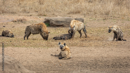 Fototapeta premium Spotted hyenas feeding on a warthog