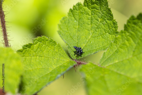 Naklejka premium spotted lantern fly nymphs on leaf macro image