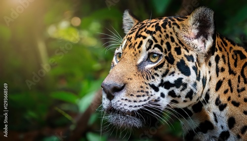 © netsay, Fototapeta premium Spotted Majestic Jaguar Roaming the Amazon Rainforest, Camouflaged Amongst Greenery and Glowing Golden under the Fading Sunlight, Capturing the Wild Beauty of Natures Hidden Gem.