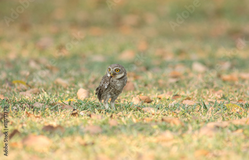 © aee_werawan, Fototapeta premium Spotted owlet catch cricket on the ground