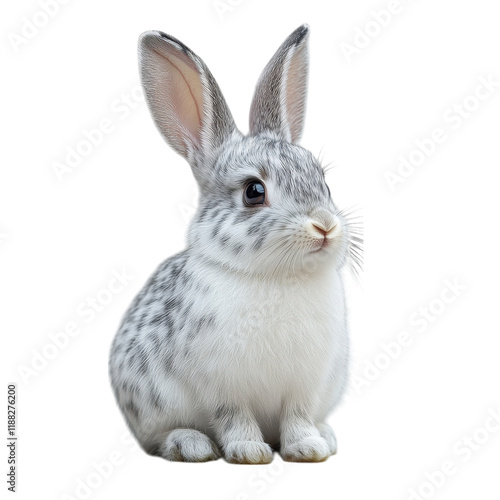 © Suradet Rakha, Obraz premium Spotted Rabbit Serenity, a calm rabbit with unique spots, centered against a clean white background, embodying tranquility and charm