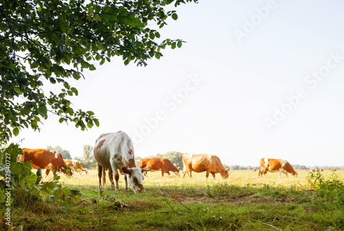 Obraz premium Spotted red cows graze in a meadow on a sunny summer day. Cattle grazing. Agricultural industry