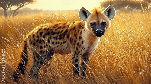 Obraz premium Spotted wild hyena standing alert in tall golden grass during warm sunlight...